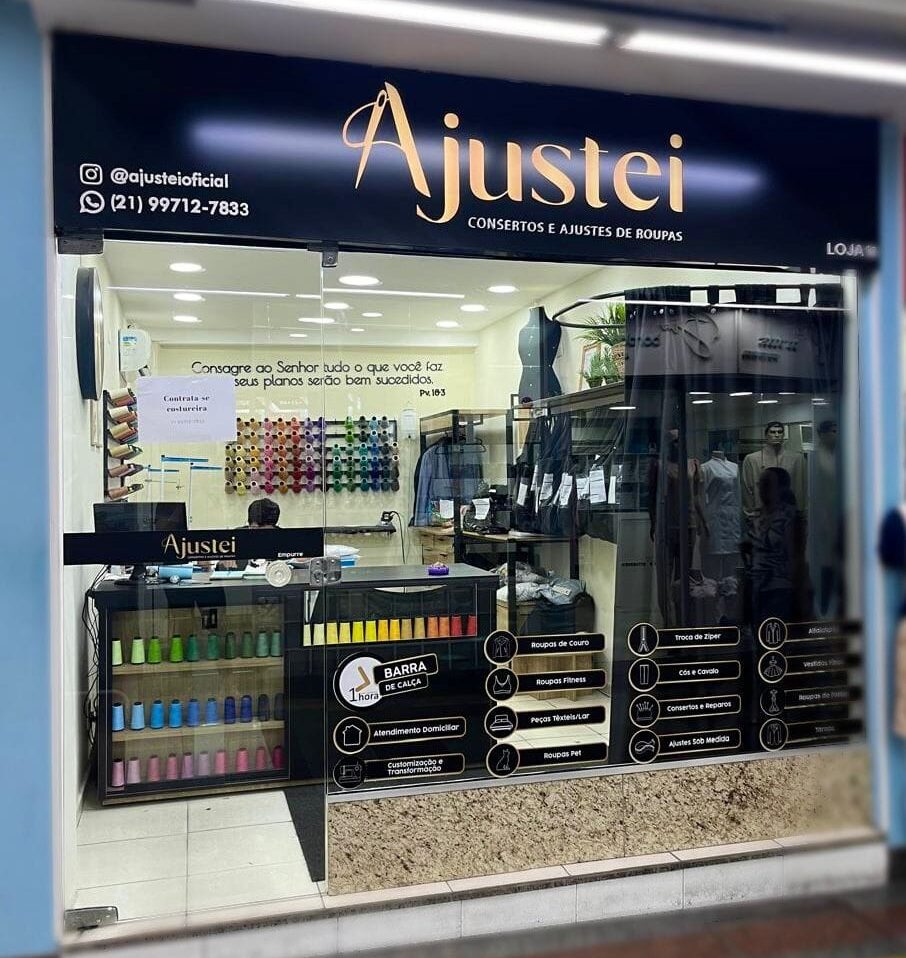 Realizamos ajustes de roupas (como bainhas, reformas e ajustes de cintura), consertos (troca de zíperes, botões, entre outros), customizações (incluindo bordados e aplicação de logos) e até transformações completas de peças.